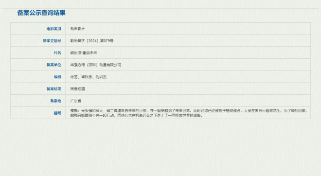 7月19日,据国家电影局最新备案公示,徐芸、崔铁志、刘圳杰编剧的《熊出没·重启未来》立项,备案单位为华强方特(深圳)动漫有限公司。