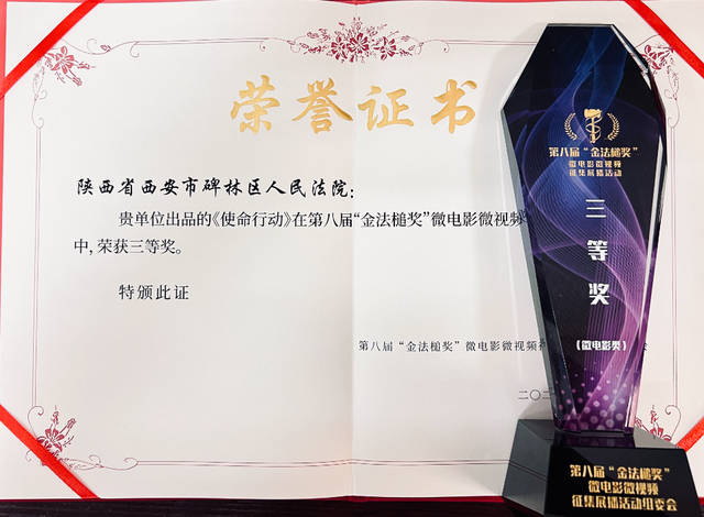 由最高人民法院政治部、最高人民法院新闻局、人民法院新闻传媒总社、最高人民法院影视中心、“学习强国”学习平台、中国政法大学、中国传媒大学、中华全国法制新闻协会办、中央广播电视总台《今日说法》、湖南省人民政府新闻办公室、湖南省高级人民法院、湖南广播影视集团有限公司等单位联合主办的第八届“金法槌奖”微电影微视频征集展播活动经征集、展播、评选,于2021年11月落下帷幕。此次活动征集到31个省、市、自治区选送的作品共1315部,其中微电影253部,微视频1062部。碑林法院在此次评选中脱颖而出,创作的微电影《使命行动》荣获三等奖。这是该院继第七届“双微”金法槌奖活动中微电影《心灯》获奖之后,再次获此殊荣。
