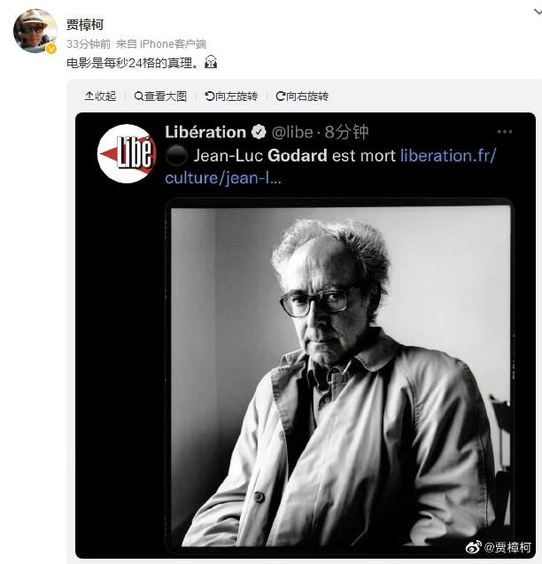 9月13日,据外媒报道,著名导演让-吕克·戈达尔去世,享年91岁。中国导演贾樟柯转发了相关消息表达了哀悼之情。