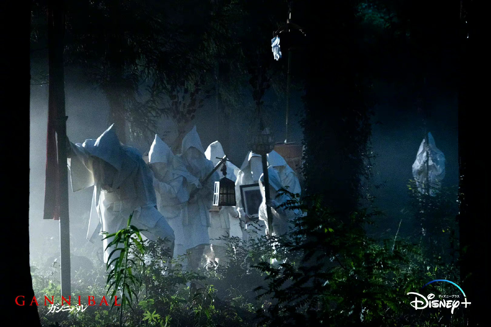 剧照营造出浓厚的恐怖氛围,一群人在黑暗树林深处行走,身穿纯白色衣服,从头到脚遮掩得严严实实,看起来怪异渗人,另一张剧照中,柳乐优弥身穿沾染鲜血的白衬衫,手背处还残留着大片暗红的血迹,前方似乎有致命危险,他双手紧紧握住手枪,神情警惕。