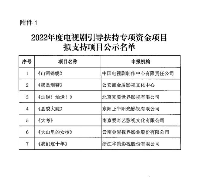 近日,国家广播电视总局发布关于2022年度电视剧引导扶持专项资金项目评审结果公示的通知。公示中包括《县委大院》《大考》《灿烂!灿烂》等7个拟支持项目、《后浪》《大山里的女校》《我们这十年》等7个“深入生活,扎根人民”拟倾斜项目。