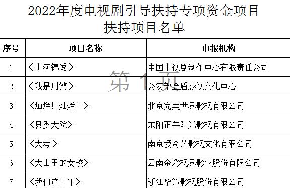 国家广播电视总局9日通过网站公布了2022年度电视剧引导扶持专项资金项目评审结果。经严格评审,广电总局最终确定了2022年度电视剧引导扶持专项资金项目扶持项目7部,“深入生活、扎根人民”倾斜项目7部。