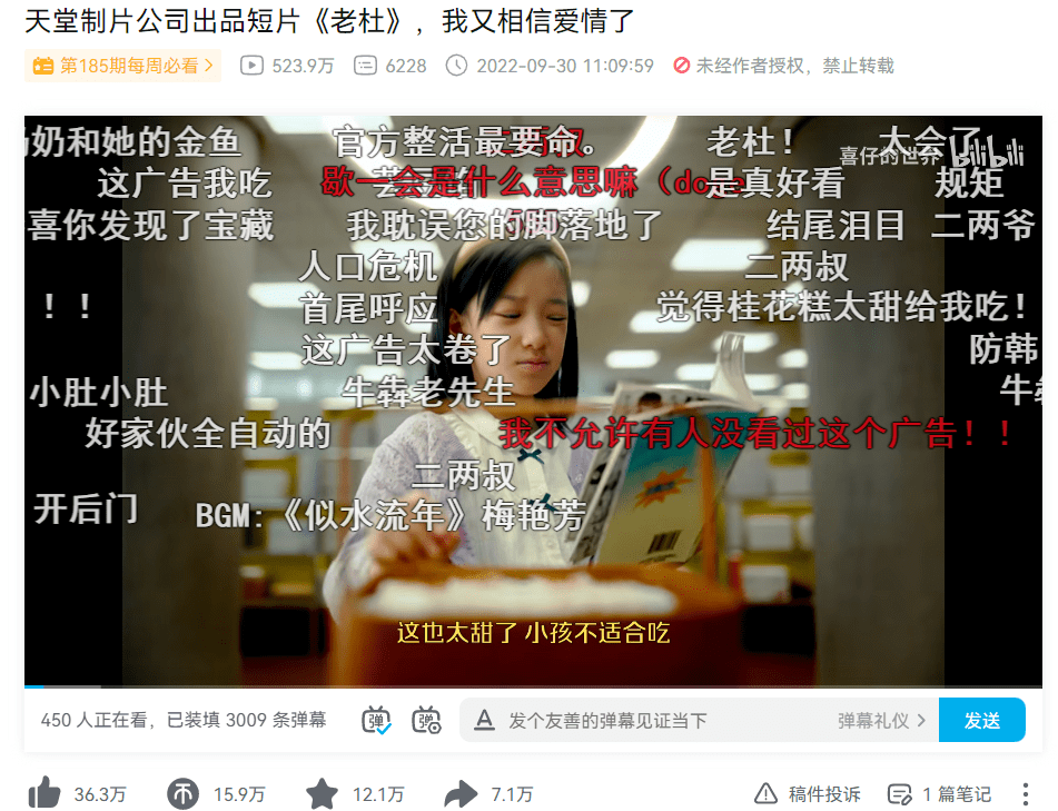 小度这支微电影一经上线便在社交平台上实现了刷屏式的传播,其中仅在B站的播放量就达到了520万+,获得36万+点赞,12万+收藏,还入选了B站每周必看榜单。无数网友在弹幕区刷着“泪目”,有网友表示以后广告就按这个标准来,感兴趣的一定会看完;也有网友称赞道广告质量比现在很多影视剧都好;还有网友说看完后想给爷爷奶奶买一台小度......短视频大行其道的今天,《老杜》究竟是如何创造破圈影响力,获得众多消费者认可的?