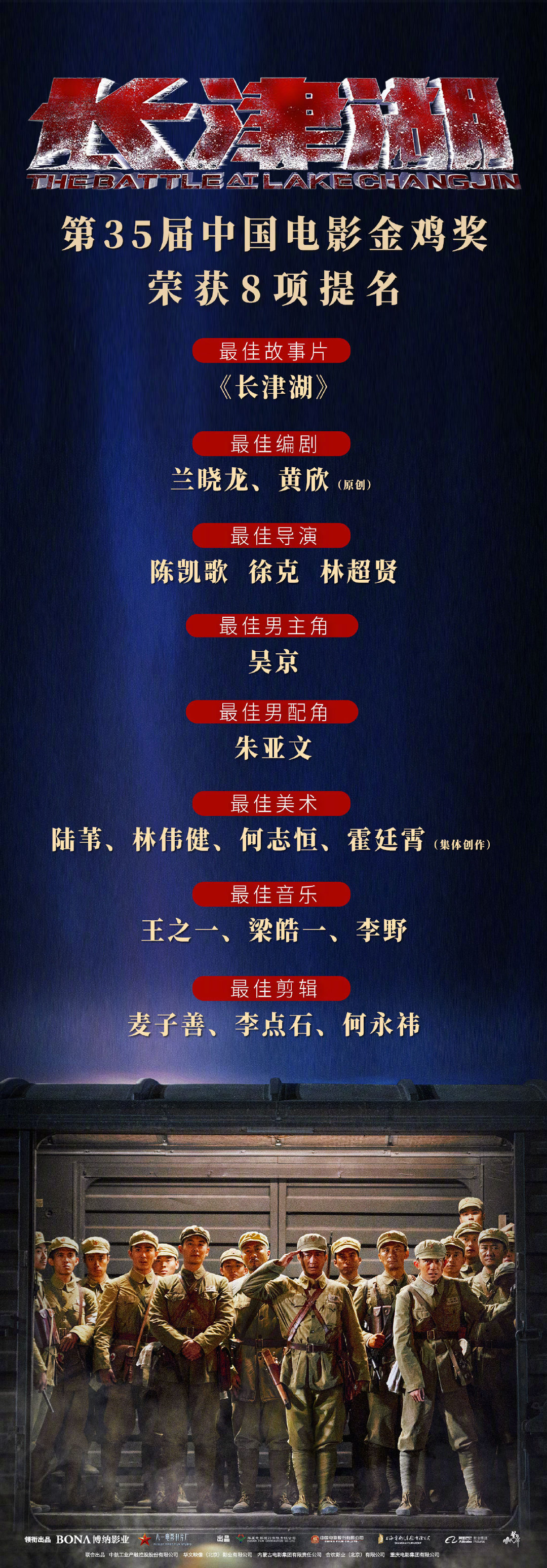 《长津湖》凭8项提名领跑。影片由陈凯歌、徐克、林超贤联合执导,吴京、易烊千玺、段奕宏、朱亚文等主演,累计票房达到57.7亿元,观影总人次达1.25亿,刷新了30多项影史票房纪录,荣登中国影史票房榜冠军。