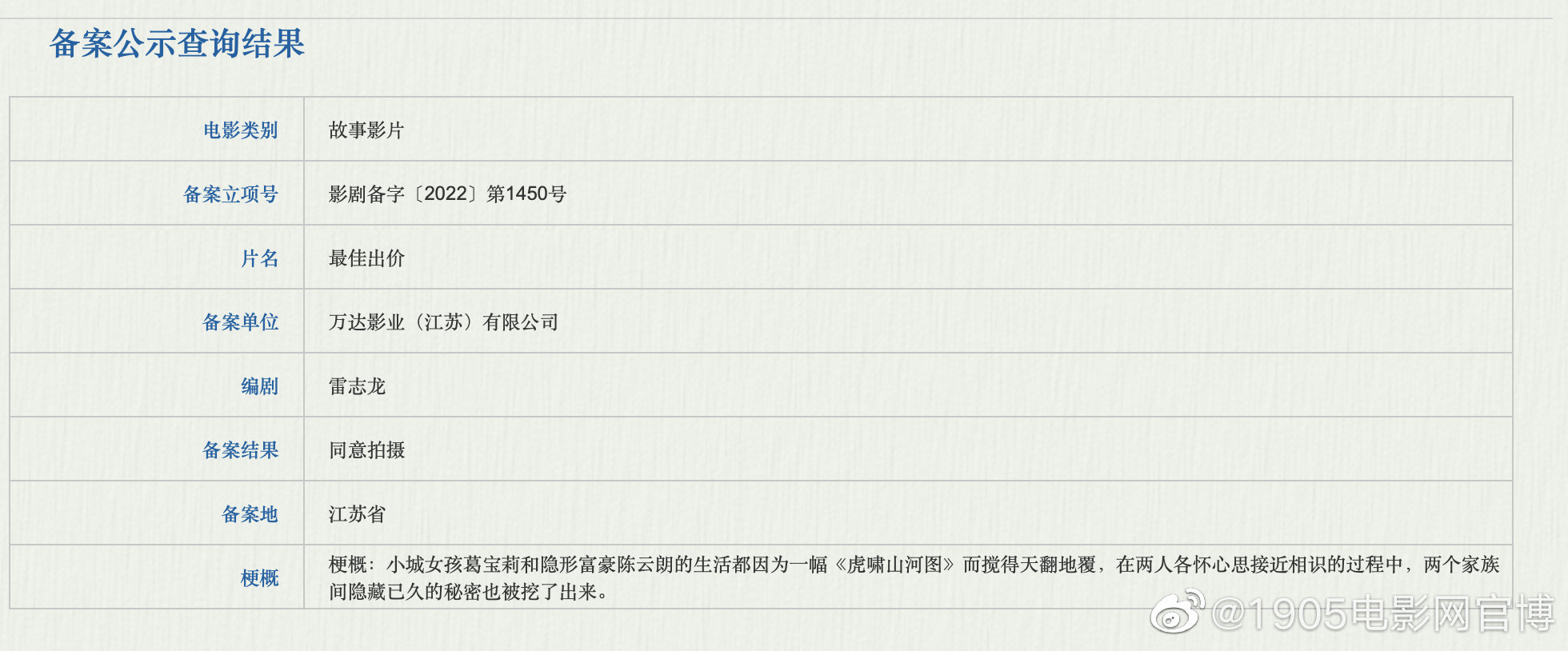 近日,国家电影局发布关于2022年7月全国电影剧本(梗概)备案、立项公示的通知。由电影《万里归途》编剧雷志龙创作的《最佳出价》正式立项,故事梗概也首次曝光。