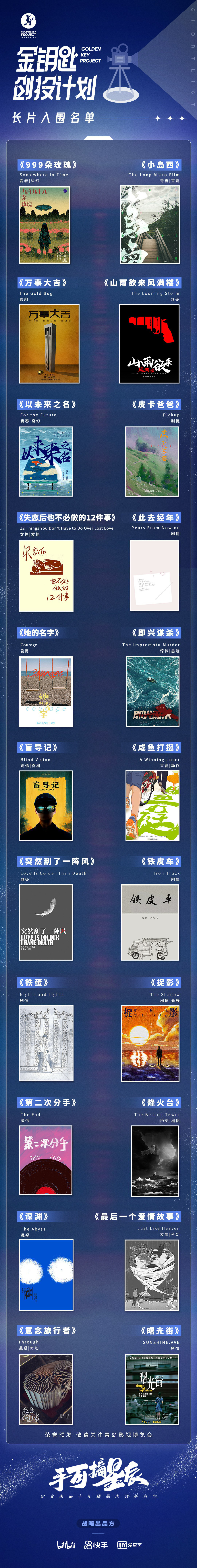 11月2日,“金钥匙创投”计划公布荣誉出品人阵容,并发布22部长片入围名单。董子健、韩天、黄轩、黄志忠、柯汶利、雷佳音、马伊琍、倪虹洁、宋佳、谭卓、于和伟、易小星、张子枫(按姓氏首字母为序排列),共13位荣誉出品人加盟“金钥匙创投”计划,他们将以自身经验与能量,助力好内容的生根发芽。