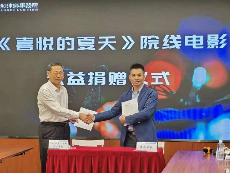 11月1日,“深圳制造”院线电影《喜悦的夏天》在深举行公益捐赠仪式。由深圳市委宣传部、龙华区委宣传部作为指导单位,深圳90后女生胡小兑编剧、导演、主演的青春校园主题院线电影《喜悦的夏天》将于11月11日全国公映。电影出品、制作方拟拿出部分票房收益捐赠给深圳市第二特殊教育学校。当日上午,院线电影《喜悦的夏天》出品方华悦影视文化传播(深圳)有限公司董事长周柏荣、深圳市第二特殊教育学校校长刘应龙出席了活动并在捐赠仪式上签字。