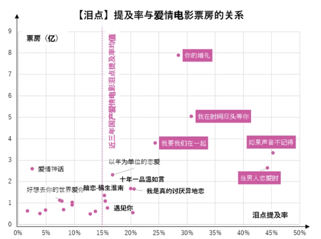观察用户评论,可发现近几年高票房电影的剧情共性就是“催泪制胜”,但用户已经出现审美疲劳。催泪剧情依靠强烈的“爱情感”共情引发共鸣,“剧情爱情”源源不断,但是2022年,同类作品已不再被大众买单,从一定程度来讲,大众对“哭片”已经“看累了”,由此反映出观影需求的转变。除此之外还有很多影响因素,如爱情的展现、结局的设定、片名的氛围等等,均对最终成绩有着直接的联系。