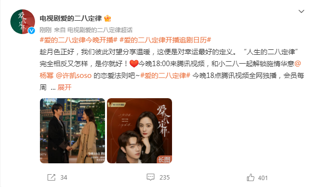 此前,这部剧就备受观众关注,在今年10月《爱的二八定律》曾宣布定档于10月13日腾讯视频播出,但临时撤档并延期播出。