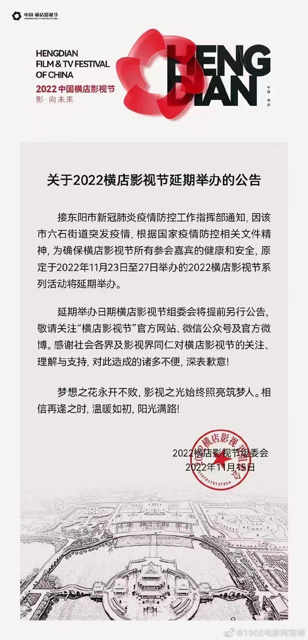 11月15日,横店影视节官方账号发布关于2022横店影视节延期举办的公告。