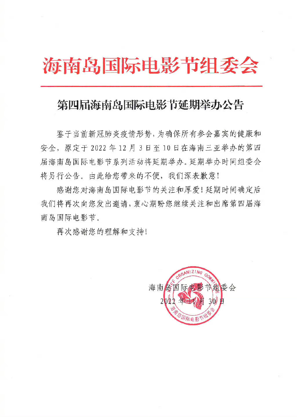11月30日,海南岛国际电影节组委会发布电影节延期举办公告。出于疫情形势考虑,原定于12月3日至10日在海南三亚举办的第四届海南岛国际电影节延期举办,新的举办日期将另行公告。