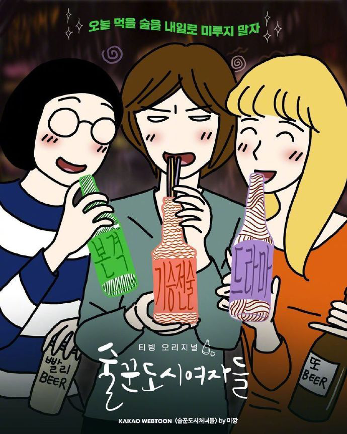 韩版《酒鬼都市女人们》由李先彬、韩善花、郑恩地、崔始源主演,讲述三个下班后总要喝上一杯酒,以喝酒作为人生信念的30岁女子的故事。第二季已于12月9日播出。