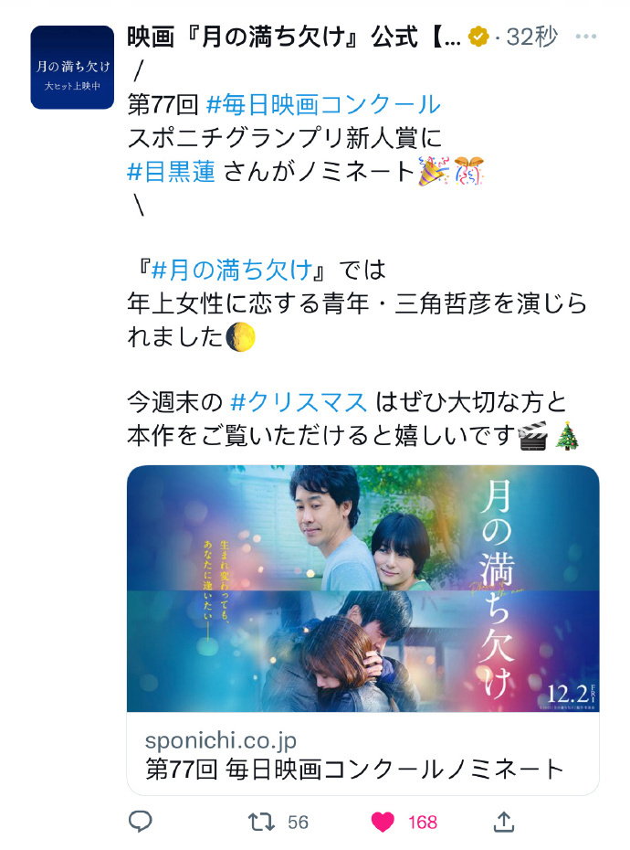 12月21日,官推发布喜讯。目黑莲凭借在影片中饰演与年上女性相恋的三角哲彦,提名了第77届每日电影大奖最佳新人男演员。每日电影大奖于1946年由每日新闻社与体育日本新闻社联合创办,是日本最悠久电影奖之一,与电影旬报、蓝丝带奖并称日本电影专业三大奖。本届获奖名单将于2023年1月19日公布。