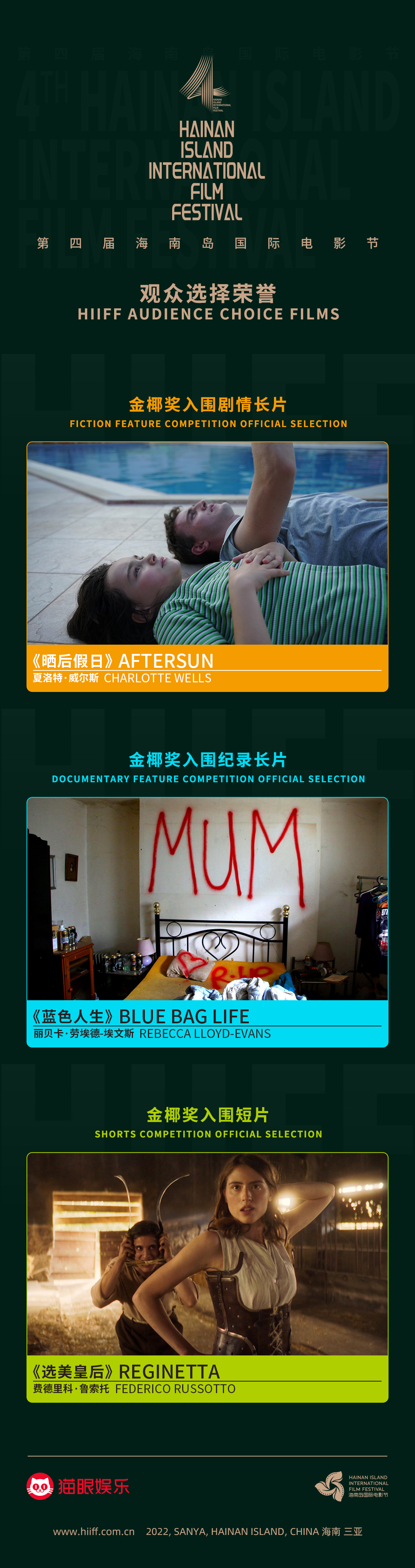 第四届海南岛国际电影节与官方独家网络票务服务平台猫眼娱乐合作,为“金椰奖”入围影片筹备了“观众选择”环节。我们邀请线下首映场的观众为自己喜爱的影片进行现场投票,也鼓励观众在每场影片结束后进行线上打分投票。