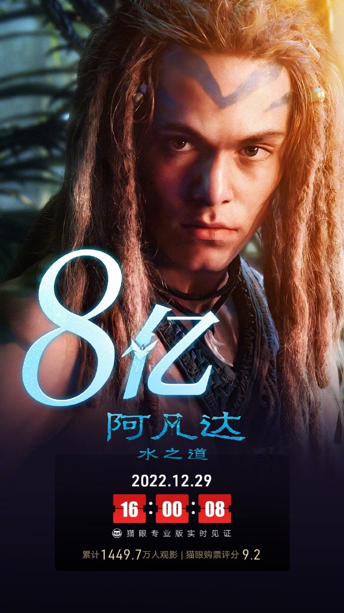 12月29日,据猫眼专业版数据显示,截至16时,科幻大片《阿凡达:水之道》在中国内地票房成功突破8亿元。