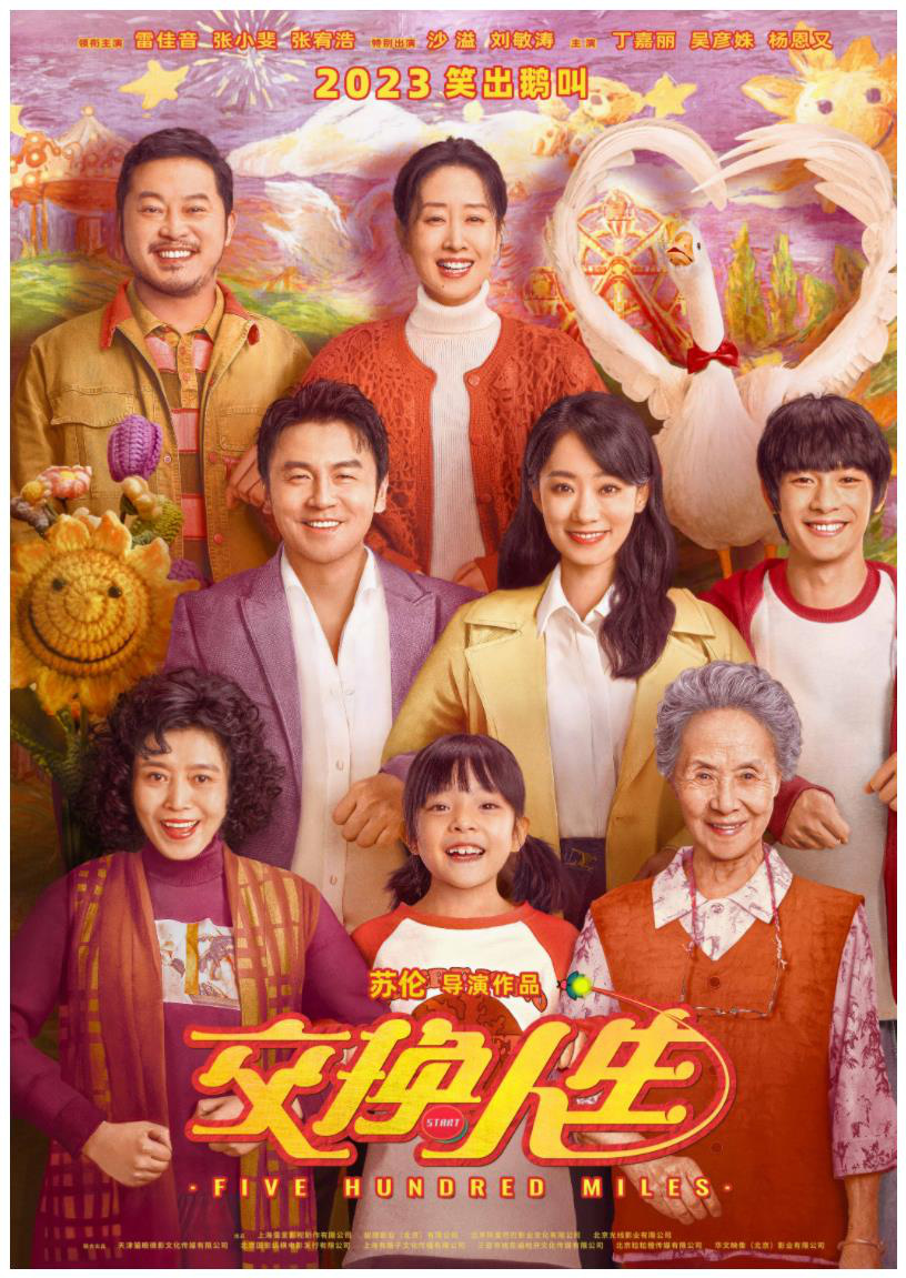 海报中,雷佳音、张小斐、张宥浩、沙溢、刘敏涛、丁嘉丽、吴彦姝和杨恩又一家人笑容洋溢,手挽着手一起“挎迎新年”,温馨又欢乐。色彩浓郁的衣服、绽放笑容的向日葵和油画质感的游乐园场景,充满着喜迎新年的快乐气息。在沙溢和刘敏涛的一旁,一只戴着领结比爱心的大白鹅十分喜感吸睛,这只鹅与一家人有着怎样的渊源,也让人对剧情浮想联翩。影片将于2023年全国上映。
