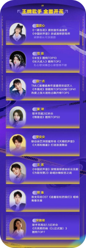 新声力量一路高歌猛进,酷狗繁星互娱的王牌歌手们自然也厚积薄发,温奕心的《一路生花》在去年就直击榜首,今年更是获得了原创音乐金曲奖,在《中国好声音》上的赤诚演绎也获得了导师梁静茹的认可及鼓励。范茹的《半生》和《长大成人》也分别获得了酷狗TOP10、酷狗TOP2的佳绩。而同为繁星酷狗王牌的田一名、童珺、李尖尖、王茗、郑鱼、宋雅萌等歌手也都获得了专属于自己的音乐荣耀。