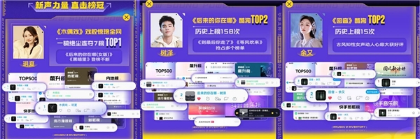 一直以来,根植于音乐基因,拥有多年深厚运营经验的繁星互娱,不管是在挖掘新声力量方面,还是在打造厂牌王牌歌手方面都是不遗余力的,因此总能在音乐榜单上夺得最佳成绩。而今年,以全新姿态开启音乐之路的玥夏、树泽、余又三人纷纷以极具个人风格的代表作开启了音乐榜单霸榜之旅。其中玥夏在《木偶戏》中的戏腔演绎惊艳全网,一骑绝尘连夺七榜TOP1 的好成绩,她的其他作品《后来的你在哪(女版)》以及《黑暗里》也是登榜不断。树泽以一首《后来的你在哪》夺得酷狗TOP2,并实现了历史上榜158次的惊人成绩,他的《到最后你走了》《等风吹来》亦是抢占了多个榜单。而余又的《回音》也同样获得了TOP2,历史上榜15次的成绩,其独特的古风知性女声更是大获好评。
