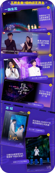 具有全平台、多方位链条式造星体系的繁星互娱,在推动艺人全方位发展、多角度提升的策略上从来都具备着不容小觑的实力。借由全平台推广资源,酷狗繁星互娱2022年也实现了热门综艺、各大卫视的多方展现。为歌手们铺就了浙江卫视《中国好声音》《为歌而赞2》《天赐的声音》,央视CCTV-3《新声乐游季》,央视CCTV-15《中国节拍》《新春的交响》,广东综艺4K频道《我和我的祖国-4K金曲展播》,陕西卫视《西安人的歌》等各大卫视综艺实力唱响的梦想舞台,并承包了多个综艺舞台热门话题。其中作为年度爆款金曲《一路生花》《怎叹》更是一直在各大舞台被明星们翻唱,歌曲热度直线飙升。