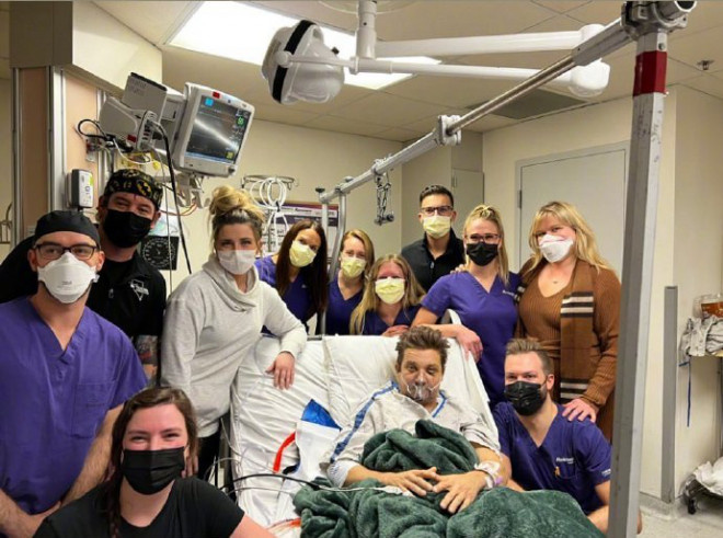 因为铲雪车事故而进入ICU治疗的“鹰眼”杰瑞米·雷纳,1月7日在医院度过了自己52岁生日。为了给自己庆生,雷纳专门发布了一张和所有ICU医生合影的照片。在照片上,他感谢了医护工作者的辛苦付出。