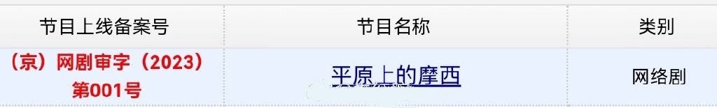 1月10日,网剧《平原上的摩西》取得发行许可证。正式播出时间暂未公布。该剧改编自双雪涛同名小说,由张大磊执导,双雪涛编剧,董子健、海清等人主演,讲述一起由出租车司机被杀案而掀起陈年旧事,共6集。