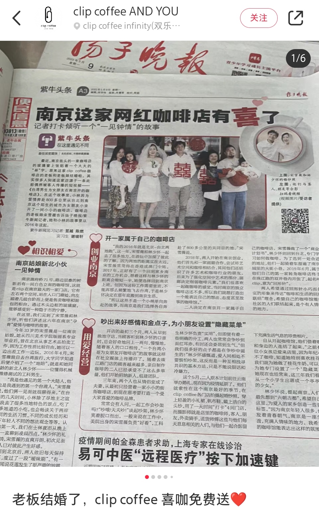 还记得扬子晚报去年5月报道的“爱情咖啡馆”的故事吗?南京姑娘宋雪薇和台湾新北小伙林少怀因一场旅行相识、相知、相爱。确定关系后,二人长期处于两地分居状态,每次约会只能“大陆—台湾两岸跑”。2017年,北漂的小宋有了一个回家乡南京工作的机会,小林辞去新北的工作,在那年底搬到南京生活。他们在秦淮区开了一家属于自己的咖啡馆,起名叫clip,回形针。