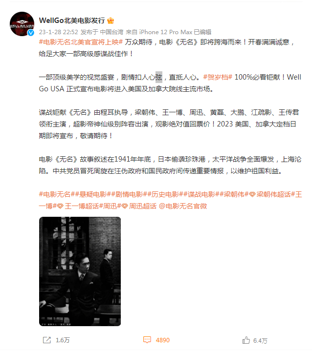 1月28日,Well Go USA官微发文正式宣布电影《无名》即将跨海而来!该片将进入美国及加拿大院线主流市场,定档日期即将宣布。