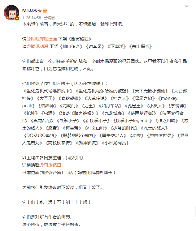 1月28日,动画制作人MTJJ木头在微博发表长文,公开喊话哔哩哔哩漫画平台和腾讯动漫平台,要求下架《幽冥诡匠》《仙山传奇》《诡案录》《下南洋》《茅山探长》几部涉嫌抄袭的漫画作品。