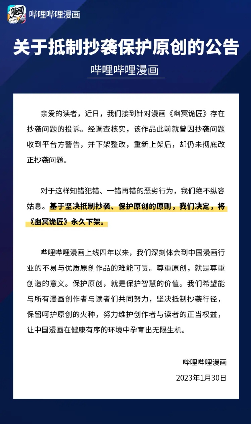 1月30日,哔哩哔哩漫画做出了回应,发布了《关于抵制抄袭保护原创的公告》,表示经过调查核实,其平台上连载的漫画《幽冥诡匠》此前就因抄袭问题收到平台方警告,并下架整改,重新上架后仍未彻底改正抄袭问题,对于这样知错犯错、一错再错的恶劣行为绝不纵容姑息,基于坚决抵制抄袭、保护原创的原则,决定将《幽冥诡匠》永久下架。