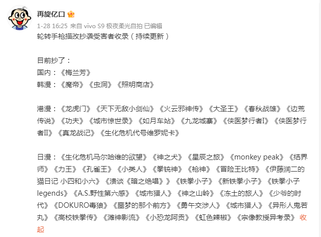 实际上,在MTJJ木头愤怒表态前,关于《幽冥诡匠》抄袭的疑云已在网上发酵很久了。在2022年6月,曾有多位网友反映该漫画疑似“描图”多部其他漫画家的原创作品,微博网友“再旋亿口”自2022年上半年起开始整合网友们找到的该漫画描图、搬运其他漫画作品分镜的对比图,从2022年6月21日起发布“幽冥诡匠抄袭合集1”,到2023年1月27日已经发布到“幽冥诡匠抄袭合集115”,涉及的疑似被抄袭的作品涵盖了国内、日漫、韩漫数十部作品。