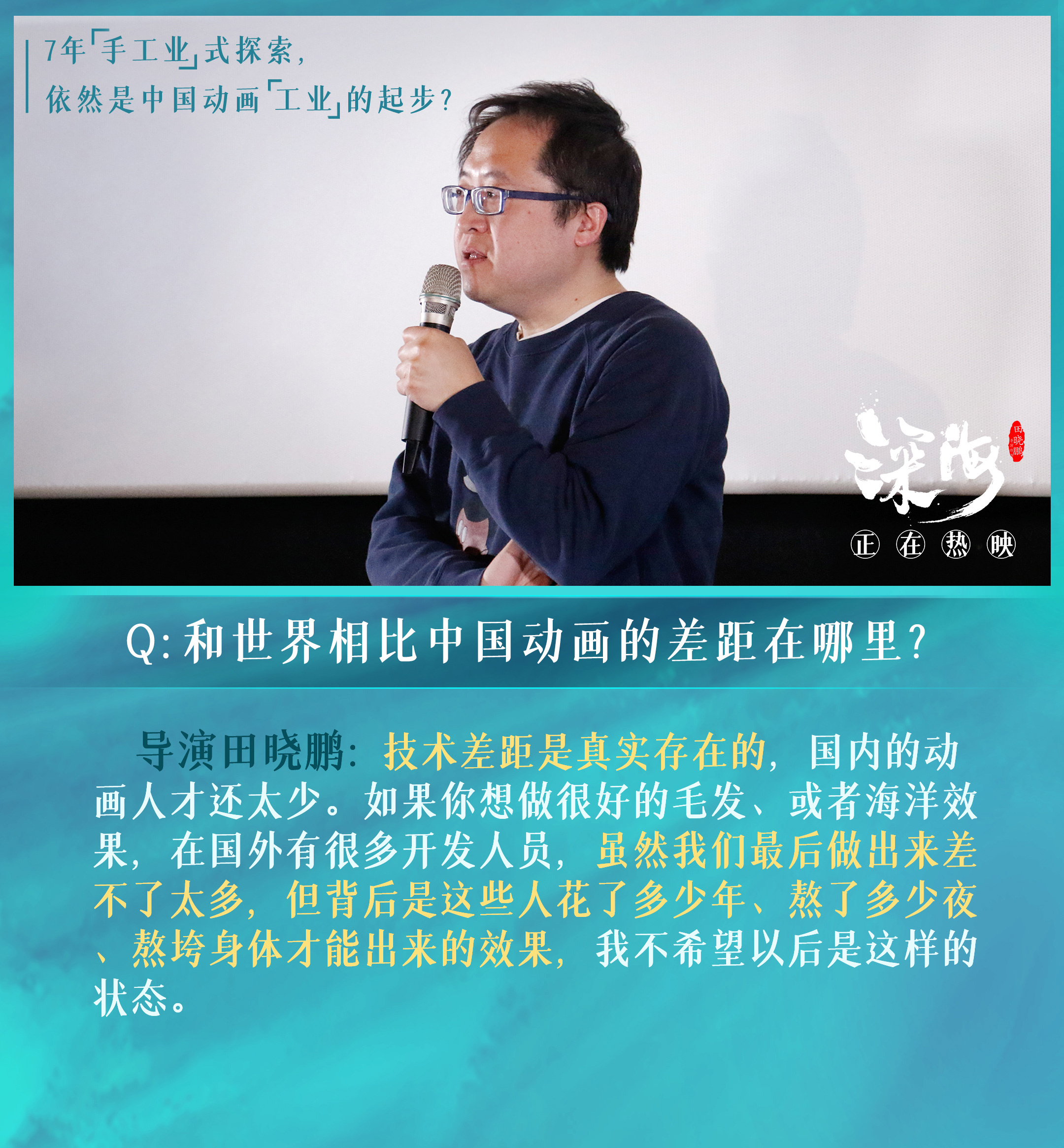 田晓鹏导演针对“顶级制作”,也表达了自己的观点。他认为中国动画并非不缺技术:“我们与世界动画大国的技术差距是真实存在的,国内的动画人才还太少。如果你想做很好的毛发、或者海洋效果,在国外有很多开发人员。虽然我们最后做出来可能差不了太多,但背后是这些人花了多少年、熬了多少夜、熬垮身体才能出来的效果,我不希望以后是这样的状态。”