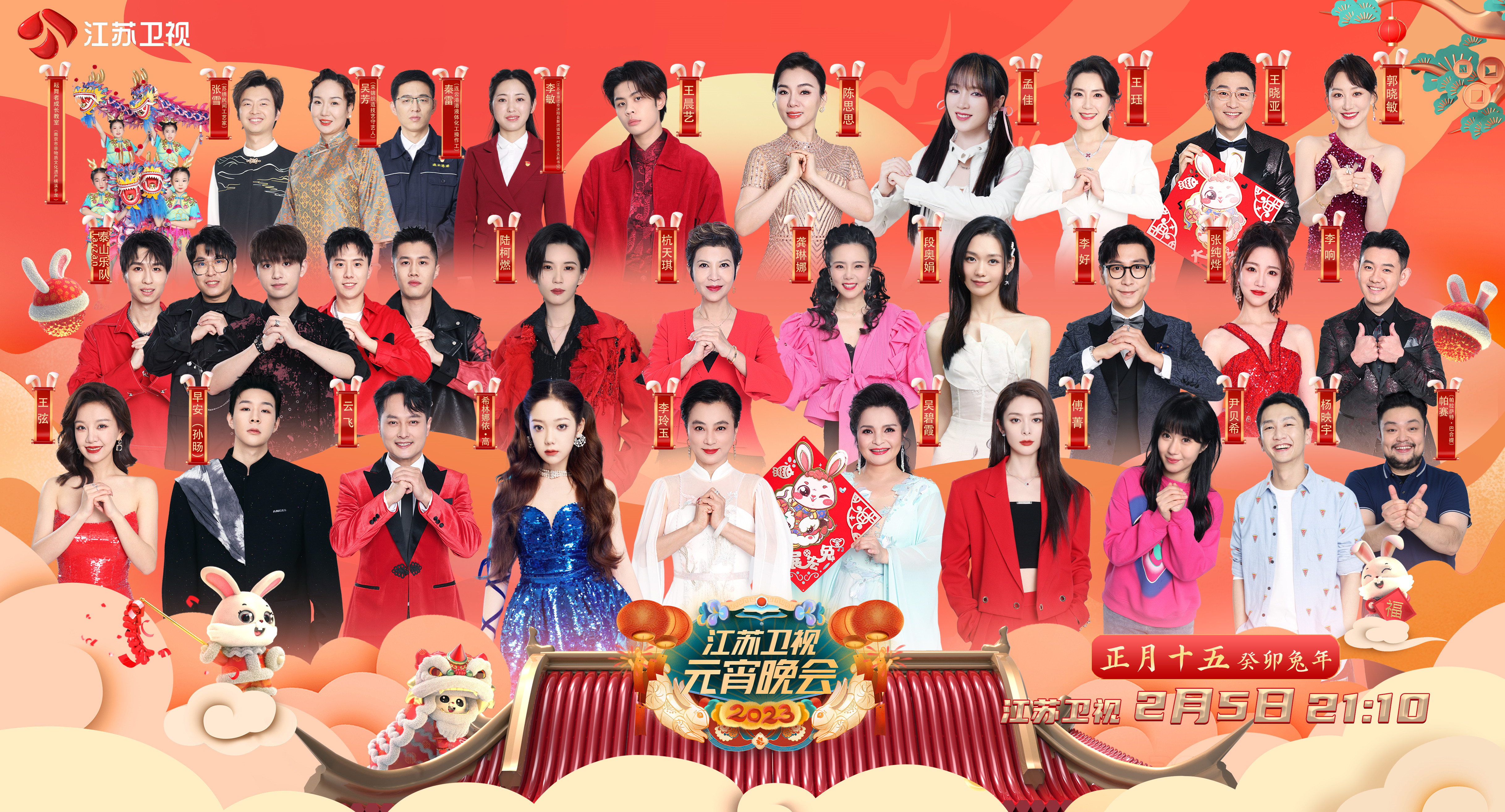 2月5日(正月十五)晚9:10,《2023江苏卫视元宵晚会》将与广大观众如期见面,为兔年春节画上圆满句号。