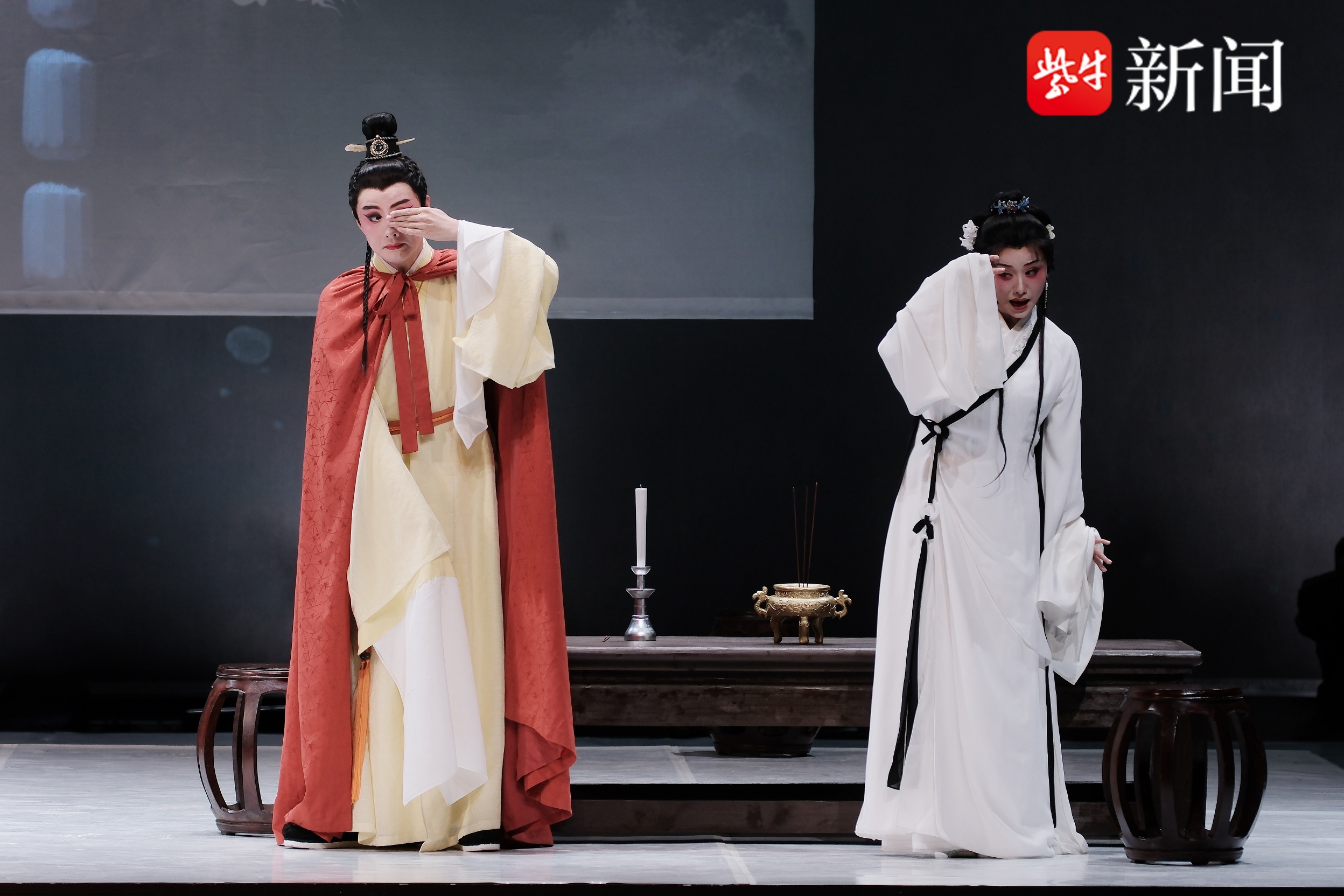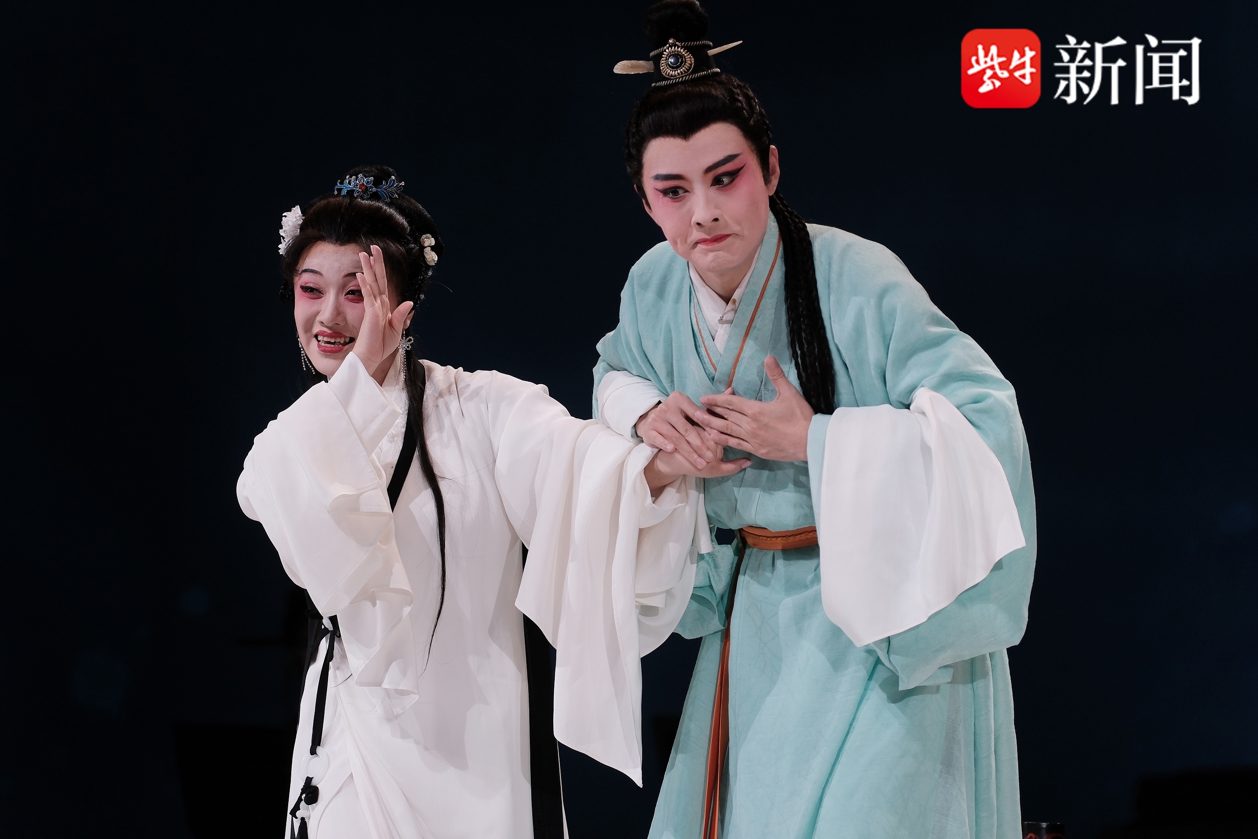 施夏明饰演的楚王孙,是庄周幻化出来的形象,舞台形象在巾生所固有的潇洒俊逸之外,更多了几分张扬,对田氏可谓极尽“撩拨”之能事。而面对田氏的“反试探”,他却不断露出马脚,尴尬窘迫难以应对,在庄周与楚王孙的身份之间切换,在愤怒与佯笑间频频“变脸”,可谓是全剧的“笑料担当”。