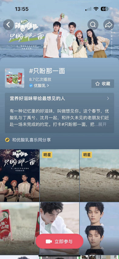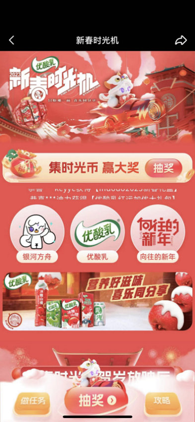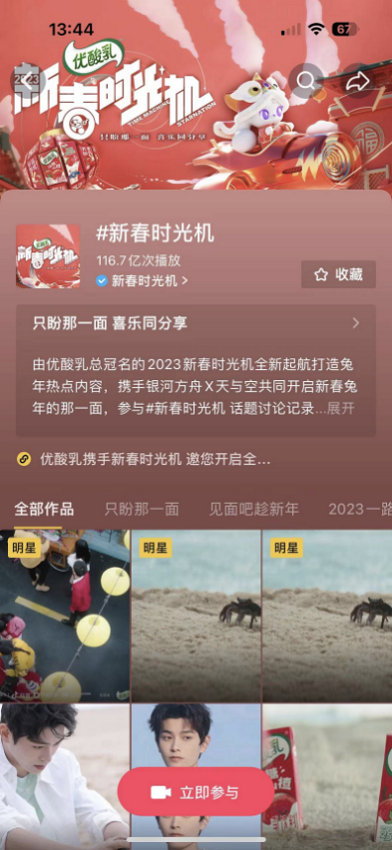 在心智种草层面,优酸乳基于抖音阵地,结合多平台传播完成差异化沟通。在抖音平台,优酸乳掀起沉浸式社交新体验,主话题#新春时光机 总浏览量达到131亿+,50+明星艺人、抖音创作者拜年造势,送出新春祝福。