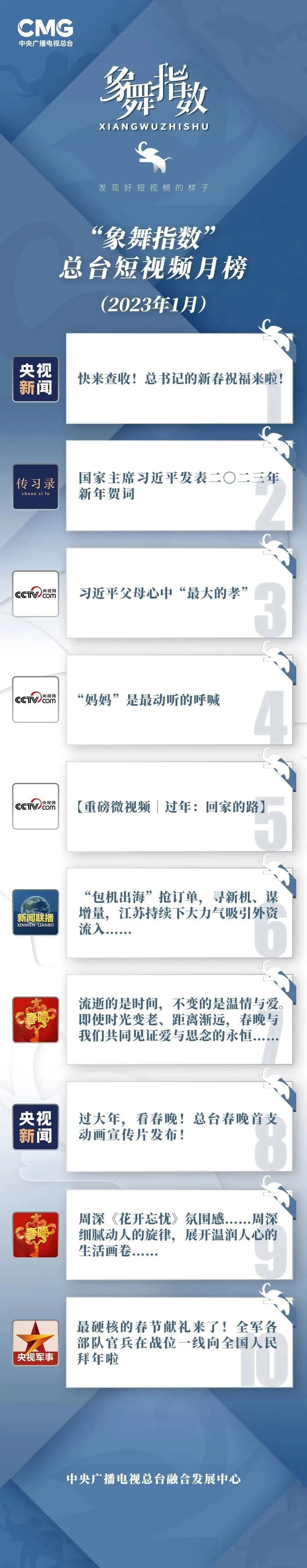 回望2023年的第一个月,全国人民在团聚的幸福中,与家人携手倾听兔年到来的钟声。一系列制作精良、备受关注的短视频,镌刻着共迎新春的集体记忆,映照着充满希望的新起点。