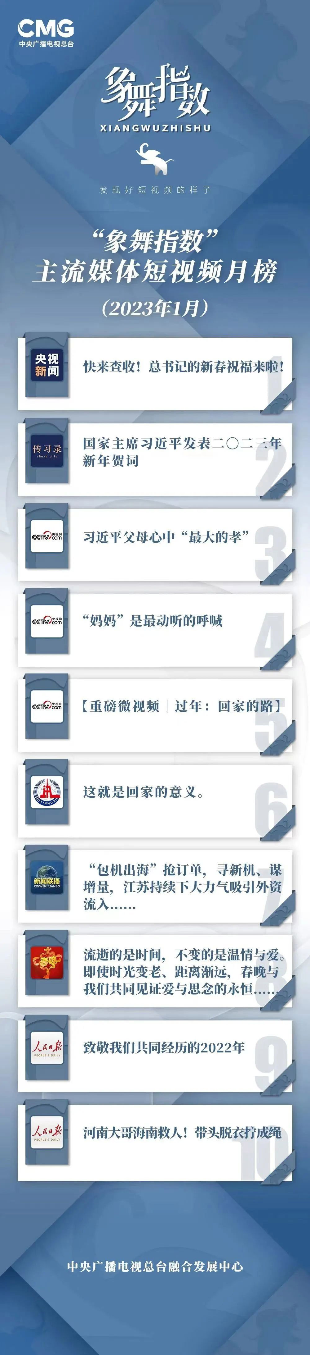 “象舞指数”评议品牌推出主流媒体短视频月榜及总台短视频月榜,既纵览全渠道主流媒体优质创作,又洞悉引领视频行业发展的总台力量,以权威视角扫描媒体融合发展进程,以专业力量助力短视频高质量发展。