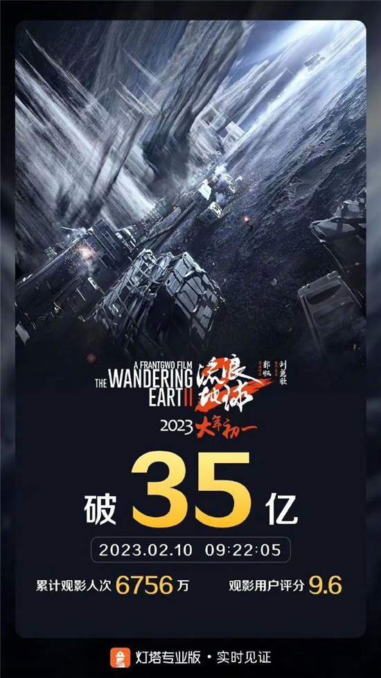 据灯塔专业版数据显示,截至2月10日9时22分,电影《流浪地球2》总票房突破35亿,累计观影人次6756万人。