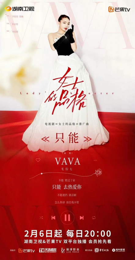 湖南卫视、芒果TV双平台独播新剧《女士的品格》2月6日开播,VaVa毛衍七为该剧倾情献唱的推广曲OST《只能》全网上线,歌曲传递独立勇敢、保持自我、奔赴热爱的女性精神。这也是首次VaVa毛衍七纯演唱抒情歌曲,清澈灵动的声音,令人耳目一新。