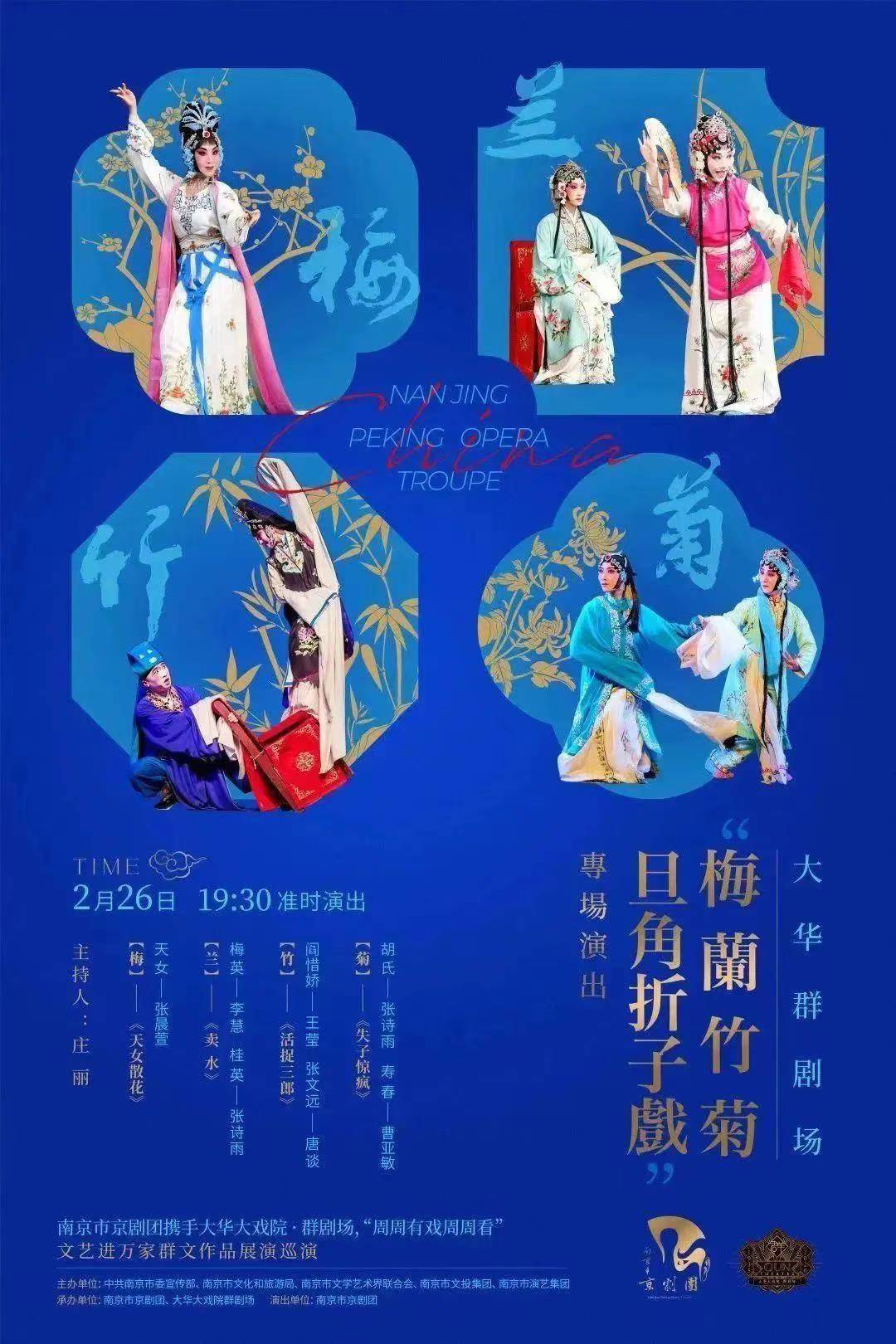 本场演出由中共南京市委宣传部、南京市文化和旅游局、南京市文学艺术界联合会、南京市文投集团、南京市演艺集团主办,南京市京剧团、大华大戏院·群剧场承办,同时也是文化进万家群文作品展演巡演。以“梅兰竹菊”为主题,分别有四折经典剧目将与观众见面。