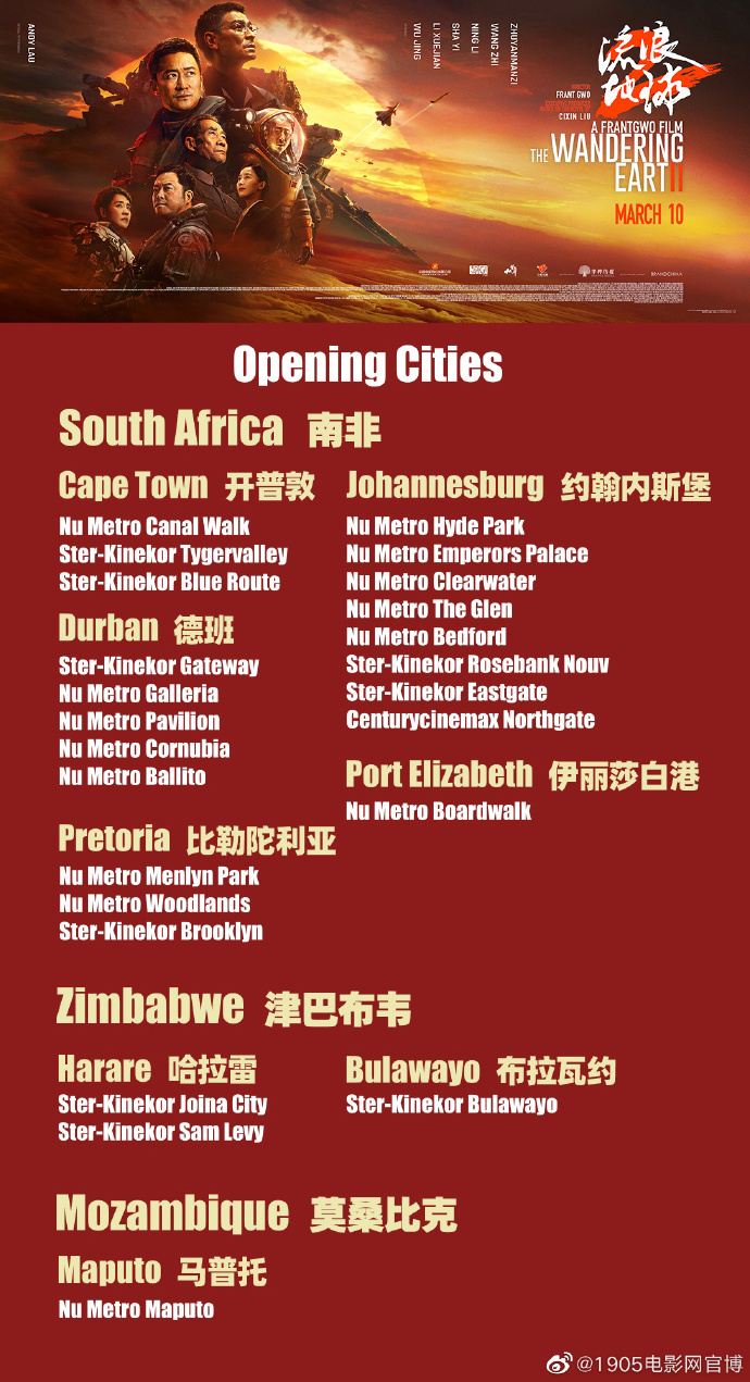 国产科幻影片《流浪地球2》将于2023年3月10日登陆南非大银幕,同日也将在津巴布韦和莫桑比克上映,并于3月17日在赞比亚陆续上映,届时将在超过25家电影院重磅上映,其中包括7块Xtreme 3D屏幕。