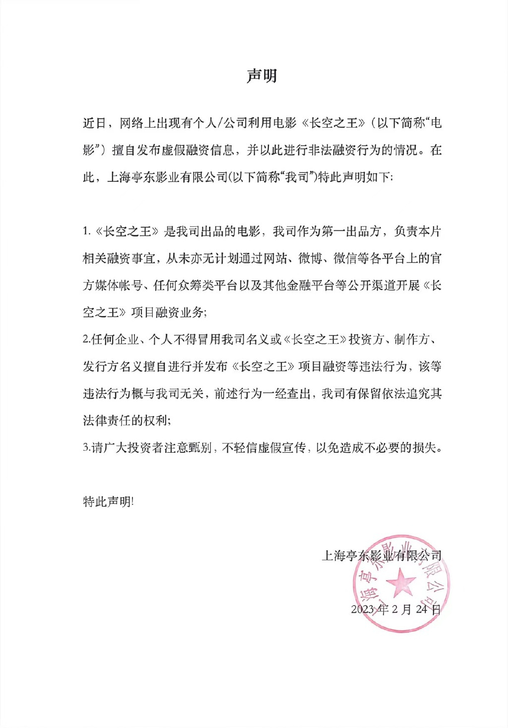 电影《长空之王》官方发布声明,称从未亦无计划通过网站、微博、微信等各平台上的官方媒体帐号、任何众筹类平台以及其他金融平台等公开渠道开展《长空之王》项目融资业务。请广大投资者注意甄别,不轻信虚假宣传,以免造成不必要的损失。
