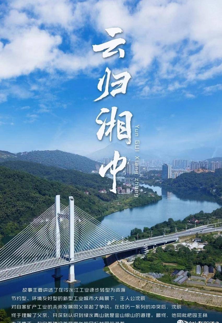 《云归湘中》讲述了在冷水江市工业逐步转型为资源节约型、环境友好型的新型工业城市大背景下,主人公沈辰对自家矿产工业的未来发展同父亲起了争执。在经历一系列的冲突后,沈辰终于理解了父亲,并深刻认识到绿水青山就是金山银山的道理。最终,他同枇杷园主林木子携手一起向着建设美丽家乡的目标共同前进。