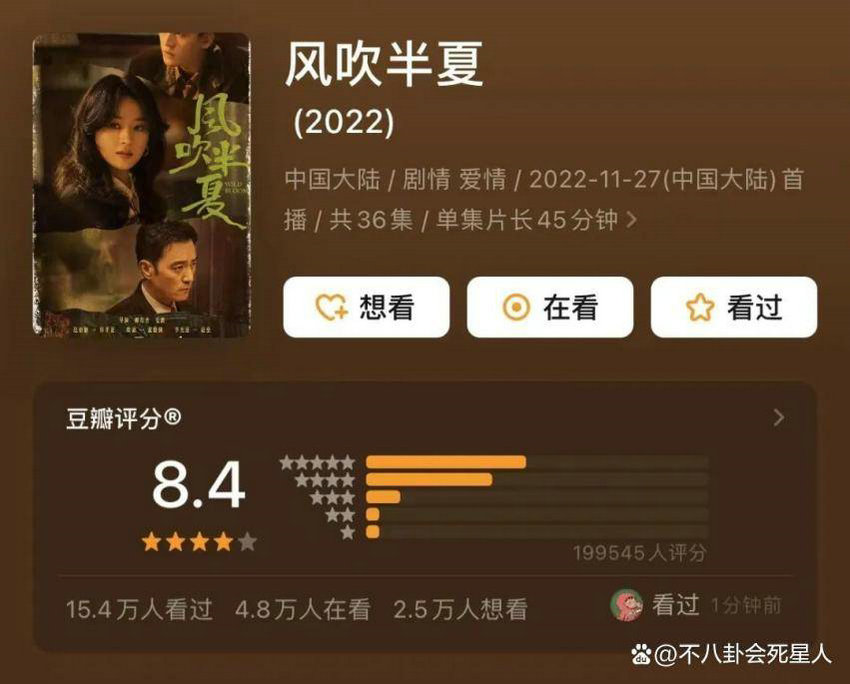 去年年底上线的《风吹半夏》以难挡之势霸屏微博热搜榜,在收视地盘整体低迷的情况下实现了双台破1,而在口碑方面,《风吹半夏》更是火力全开,豆瓣评分开分8.4,获得观众的一致好评。
