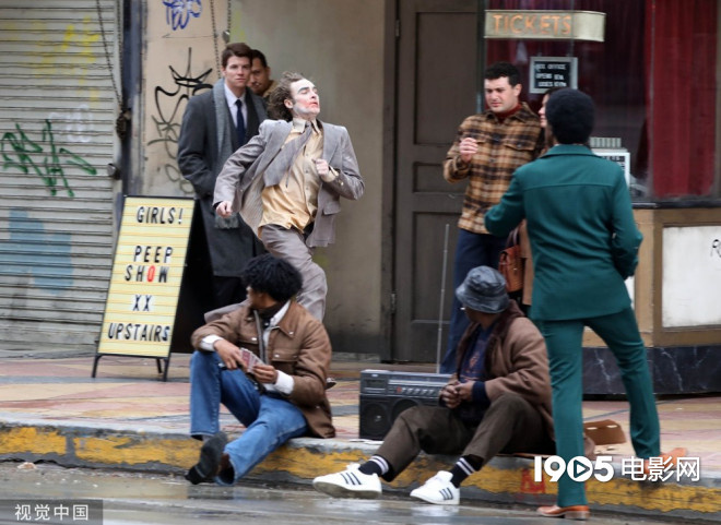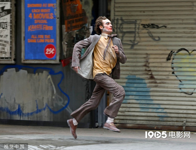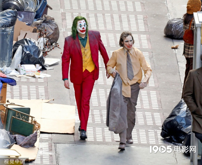 当地时间2023年3月4日,美国加州,电影《小丑2》片场曝光了一组花絮照。照片中,身穿灰色西装的华金·菲尼克斯化着已经花掉的“小丑装”,灰头土脸地在街头狂奔,身后还有另一个“红衣绿发”的小丑紧跟其后。