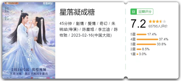 在豆瓣平台上,《星落凝成糖》获得了7.2的较高评分,热赞网友评价:超出预期、轻松搞笑、特效惊艳,堪称仙侠版“上错花轿嫁对郎”。