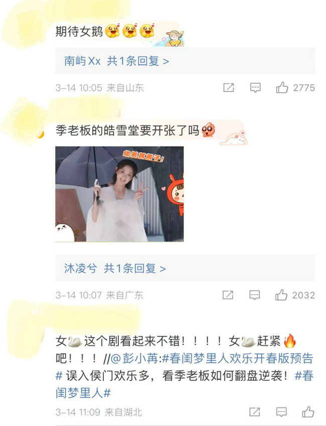 不少网友热情留言:“终于要开播了吗?!期待女鹅新剧!”、“女鹅这个剧看起来很不错,女鹅赶紧火吧!”、“彭小苒的演技实力拿捏古偶剧那绝对是妥妥的!”、“女鹅新剧人设好带感啊!快快播出吧,已经迫不及待想看啦!”。