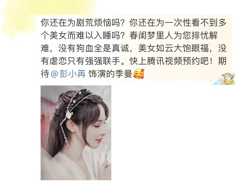 近几个月一直有网传消息称《春闺梦里人》将在今年3月份上线腾讯视频播出,本月以来官方频频释出新物料,估计离定档的日子不远了!期待彭小苒在剧中的精彩演绎!