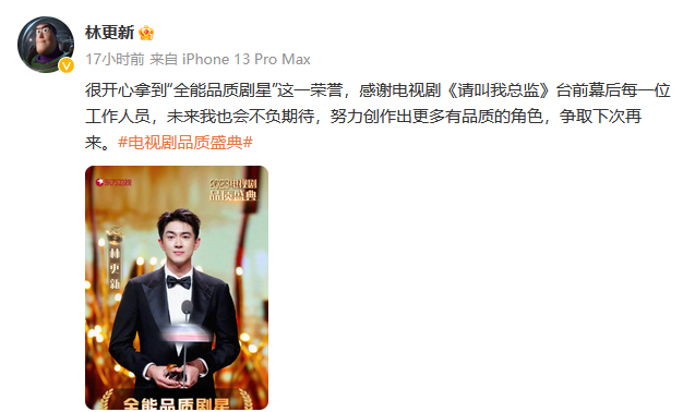 林更新在此次盛典中获得了“全能品质剧星”奖。他在社交平台表示“很开心拿到全能品质剧星这一荣誉,感谢电视剧《请叫我总监》台前幕后每一位工作人员,未来我也会不负期待,努力创作出更多有品质的角色,争取下次再来。”在作品《请叫我总监》中,他饰演的陆既明这一角色跳脱了寻常霸总的套路,为之眼前一亮。