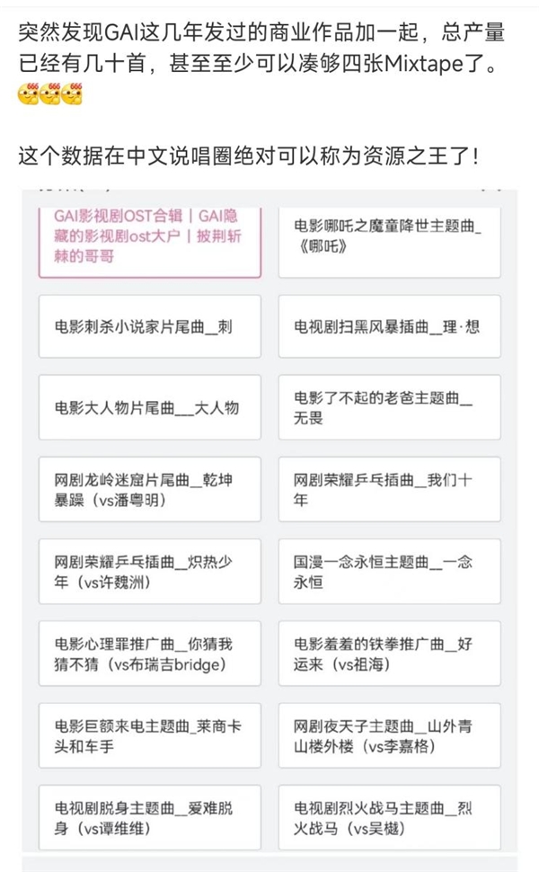 GAI周延将其独特的GAI式说唱和影视主题完美契合,不仅赋予歌曲新生命力,也使得音乐成为影视作品的助燃剂,助力多方位诠释影视作品主题。
