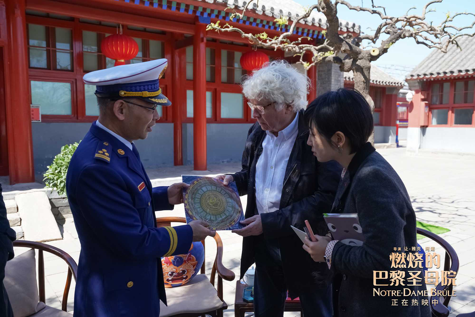 活动现场,工作人员向让-雅克·阿诺介绍了天安门地区消防救援支队故宫特勤站的历史及所获荣誉。参观过程中,消防指战员展示了特勤站先进的消防器材,并邀请让-雅克·阿诺试穿消防服、试操消防车,手握高压水枪、身着重型装备的阿诺导演,颇具真实消防员的风采。随后环节中,阿诺导演收到了故宫特勤站赠送的“藻井鼠标垫”,寓意辟火消灾,故宫特勤站则收到了阿诺导演赠送的《燃烧的巴黎圣母院》浮雕海报。作为东西方文明代表,故宫和巴黎圣母院均饱藏着各自民族的智慧,蕴含着丰富的民族情感,无论遭遇任何损伤,都是人类文明的损失。正因如此,消防英雄不分国界,消防事业人人有责。